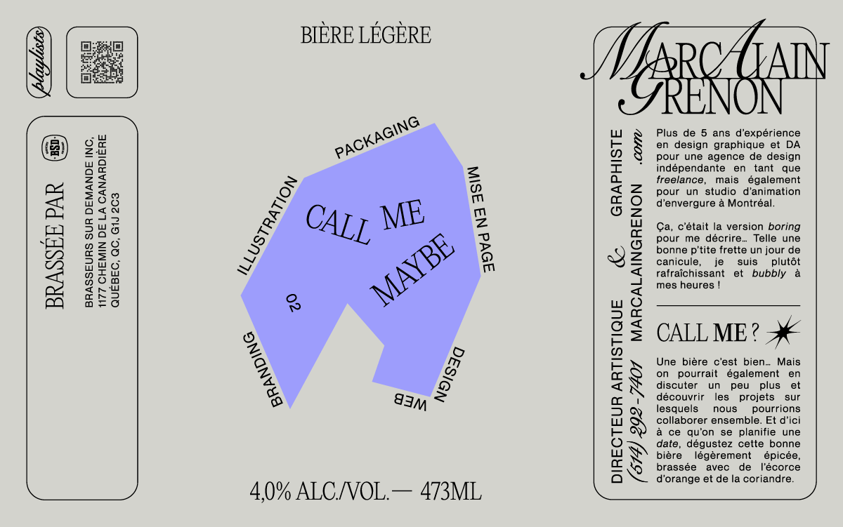 Au début de l’année 2023, j’ai eu l’envie de lancer ma propre marque de bières artisanales pour promouvoir mes services auprès des diverses agences créatives de Montréal. Une façon plutôt inusitée de le faire, question d’essayer de se démarquer de la masse !